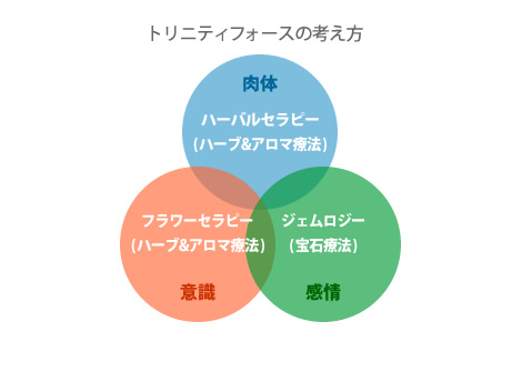 こういった様々なトリニティを良い方向へ導き、美と健康を維持増進させる手段として、「ハーバルセラピー」「フラワーセラピー」「ジェムロジー(宝石療法)」の三療法を三位一体と考え、“トリニティセラピー”としてご提案しています。